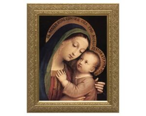 An 8 x 10" print of Our Lady of Good Counsel, a serenely beautiful portrait of our Blessed Mother, with the beautiful eyes of Jesus looking back at her. Our handcrafted image comes as a fine art print in an attractive gold solid wood frame.